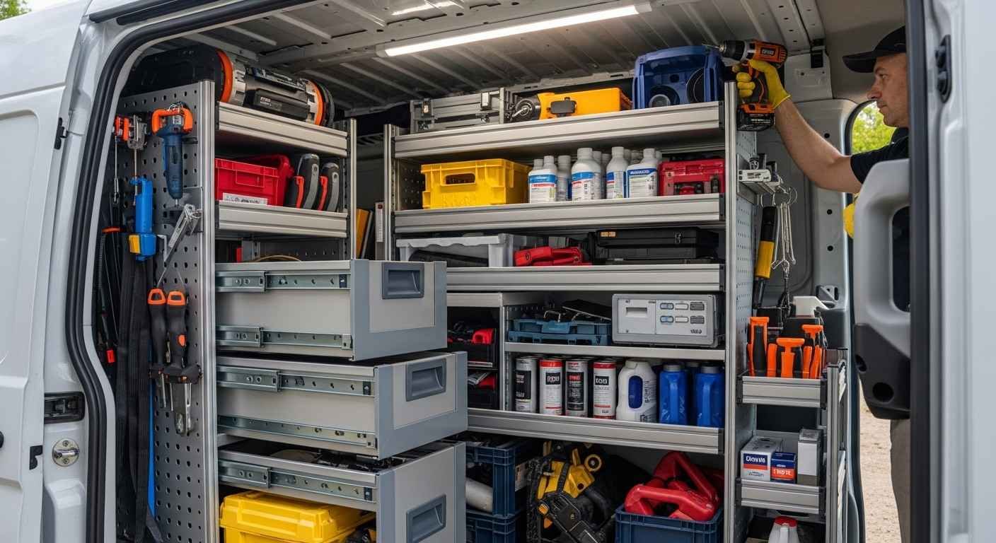 Mit einem strukturierten Innenausbau wird der Laderaum optimal genutzt. Regalsysteme, Schubladen und Halterungen sorgen dafür, dass jedes Werkzeug seinen festen Platz hat. Das spart Zeit, reduziert Stress und erhöht die Effizienz im Arbeitsalltag erheblich.